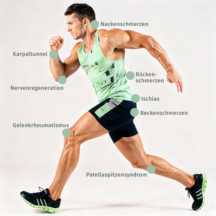 Besonders zur Schmerzlinderung, Muskelentspannung oder-aktivierung, zur Förderung der Durchblutung und des Stoffwechsels wird diese Therapie empfohlen. Sie kann auch als Unterstützung der Regeneration bei Verletzungen, Arthrose, Bandscheibenproblemen und Sehnenreizungen angewandt werden.